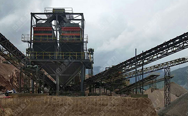 主要設備(bèi):振動給料機、重型錘(chuí)式破碎機、雙轉子制砂機、圓振動篩等。