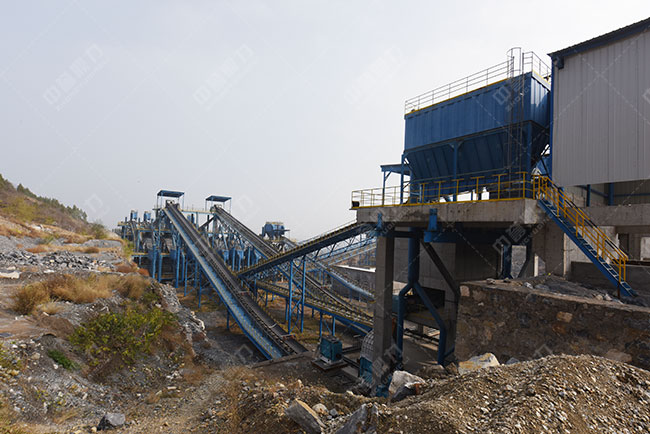 從山上爆破下來的石料(小於(yú)1020mm)由自卸車(chē)送入振動給料機,振動給料機再将其均勻的送入颚式破碎機。颚式破碎機對石料進行段破碎,經颚破破碎後的石料在150mm--300mm左右,通過振動給料機被送入液壓圓錐破碎機進行段破碎。破碎後的物料經過圓振篩分級篩分,大於(yú)40mm的物料重新返回圓錐破加工,40mm以下的物料由皮帶輸送機送入整形機整形。整形後的成品經經過圓振篩分級篩分,由皮帶輸送機輸送至成品區。