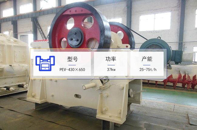 PEV-430×650颚式破碎機是小型石料處(chù)理加工設備(bèi),進料口尺寸是430×650mm,進料規格在360mm以下,出料規格在40-100mm左右,使用的電機功率是37kw,一小時可破碎石料25-75噸。