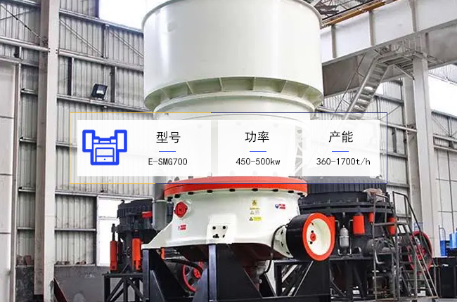 E-SMG700單缸液壓圓錐破碎機是大型石料中細碎設備,能夠破碎粒度不大於(yú)560mm的石料,破碎後的出料要在13-90mm之間,可採(cǎi)用的電機功率是450-500kw,每小時的加工能力爲360-1700噸。